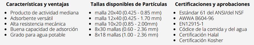 Es un carbón activado granular producido por activación con vapor de carbón de antracita.
