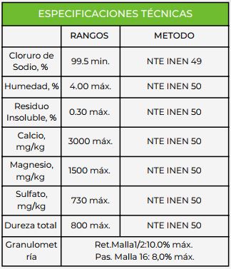 Producto conformado por cristales de color blanco cristalino, inodoro, sabor salino característico, soluble en agua e higroscópico.